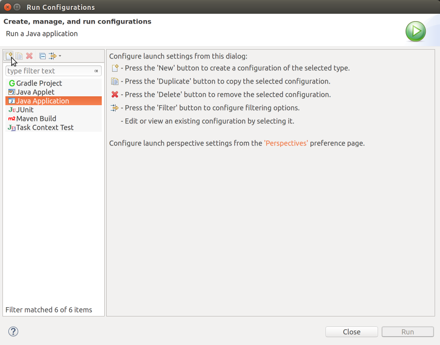 In the list on the left, make sure "Java Application" is selected. Then, in the top left corner of the inner pane click on the leftmost item. (When you mouse over it should show New launch configuration.)